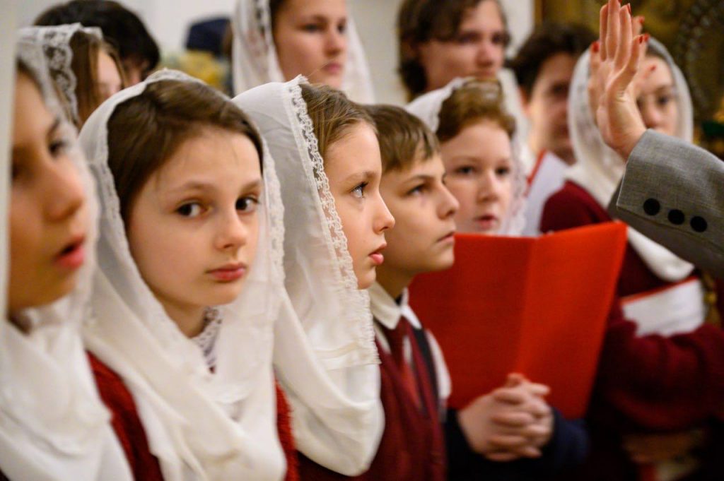 Песнопения Литургии исполнил детский хор школы под управлением учителя музыки и руководителя школьного хора Анастасии Зубковой.