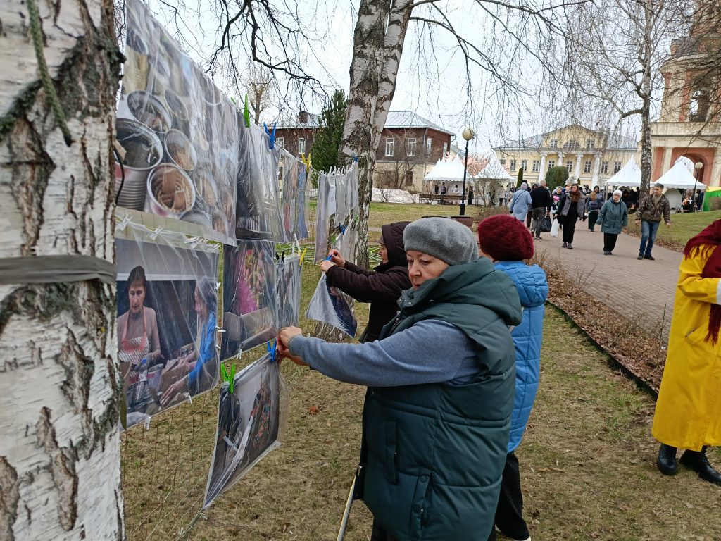 11 апреля 2026 г. в Великую Субботу социальной службой Патриаршего подворья храма Живоначальной Троицы в Свиблово была организованна акция по сбору средств для волонтерских групп, занимающихся помощью СВО. В парковой части между деревьями были натянуты маскировочные сети и на них расположилась фотовыставка «Матери сыновьям!». На фотографиях были представлены все виды деятельности волонтеров. Это плетение сетей, изготовление маскировочных костюмов, вязание носков, отливание окопных свечей, изготовление сухих обедов. Группа волонтеров из района Свиблово, во главе с председателем ветеранской организации полковником запаса Болотовым Анатолием Петровичем, в полном составе дежурили возле своей фотовыставки «По зову сердца». Они объясняли желающим, как присоединиться к плетению сетей и собирали средства на расходные материалы. Душевные фотографии привлекли внимание многочисленных жителей района Свиблово, пришедших на освящение куличей. Фотовыставки вызвали большой интерес и нашли отклик в сердцах гостей Патриаршего подворья.