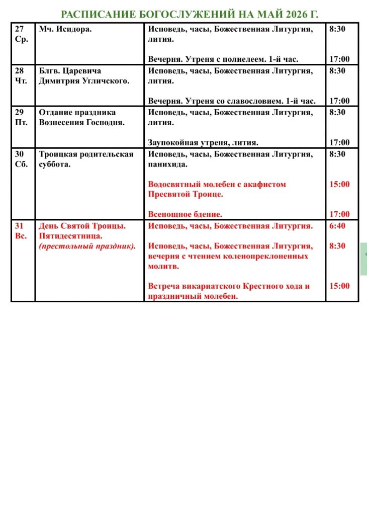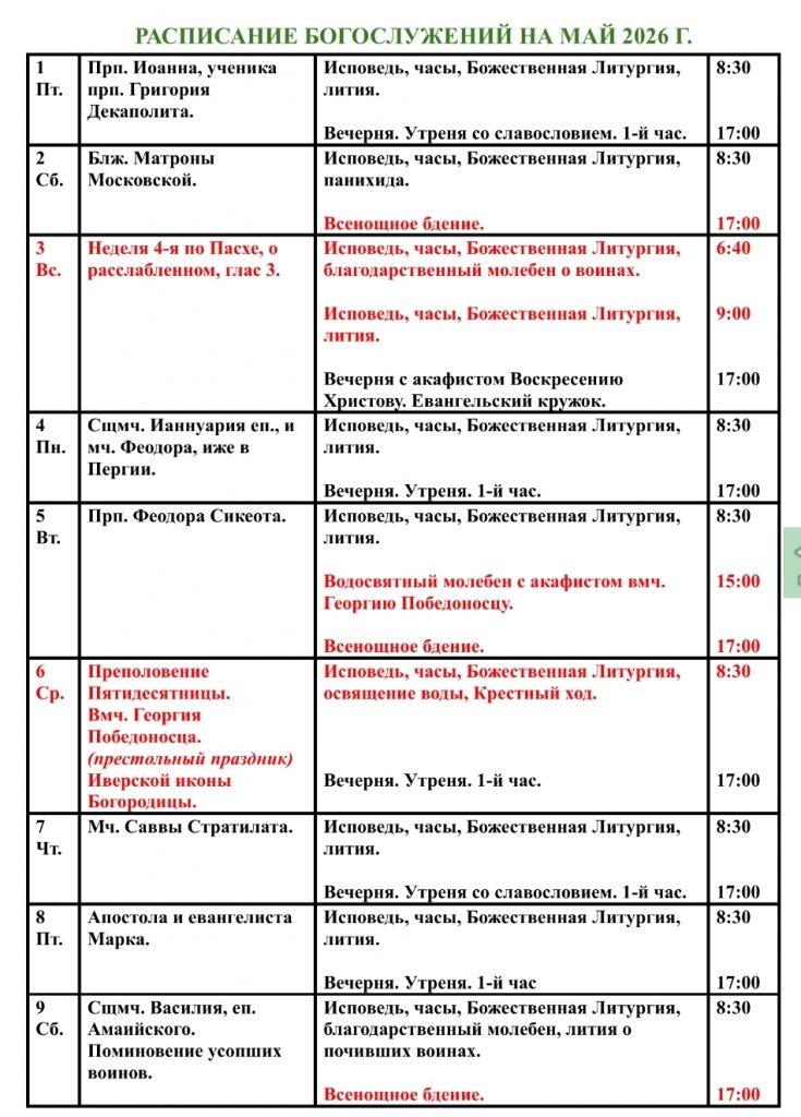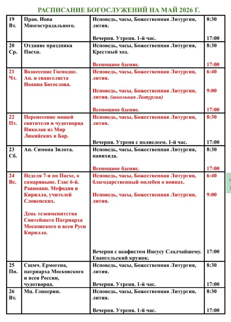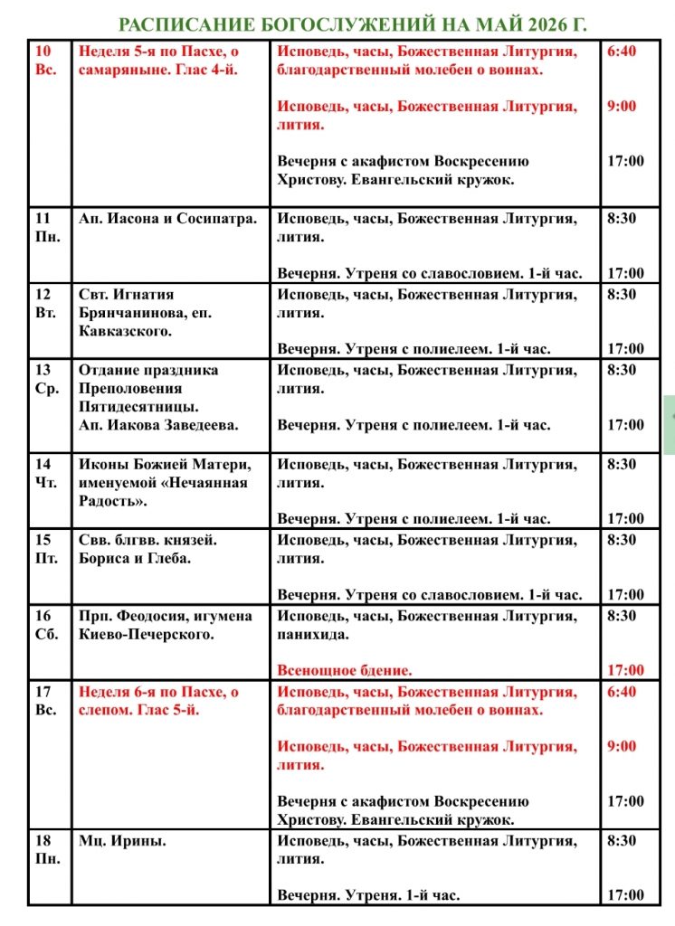 Домашняя/Приходские новости/Анонс/Расписание богослужений на май 2026 г. в Патриаршем подворье в Свиблово АнонсБогослуженияДвунадесятые праздникиИнформационныеМероприятия в УсадьбеПриходские новости Расписание богослужений на май 2026 г. в Патриаршем подворье в Свиблово Пресс-служба2 дня назад 53 Less than a minute Пресс-служба2 дня назад 53 Less than a minute Facebook Twitter Pinterest VKontakte Odnoklassniki Messenger Messenger WhatsApp Telegram Viber Share via Email Печать