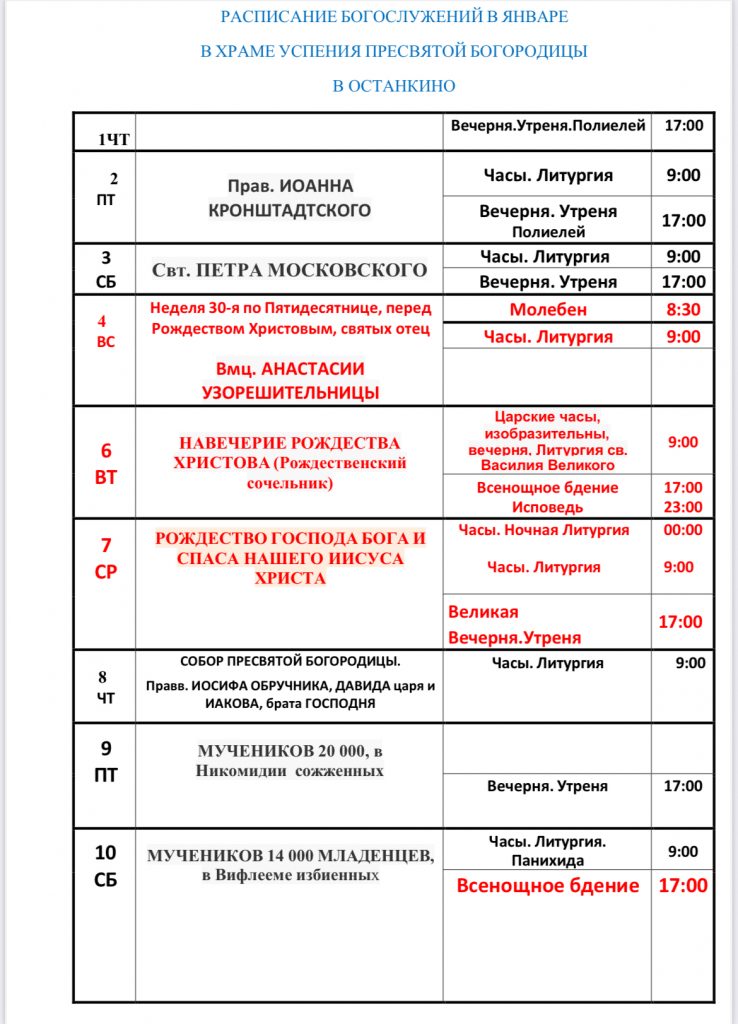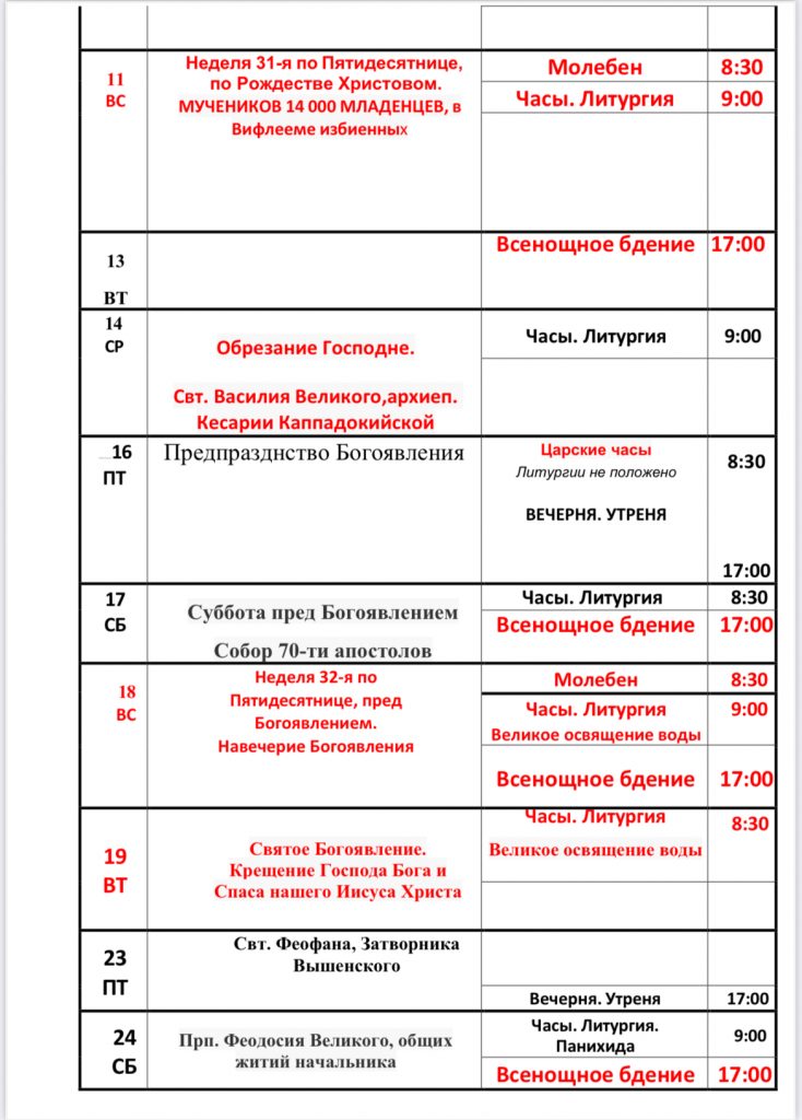 Расписание богослужений