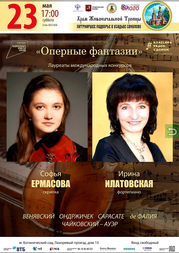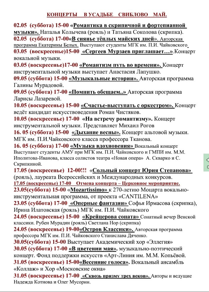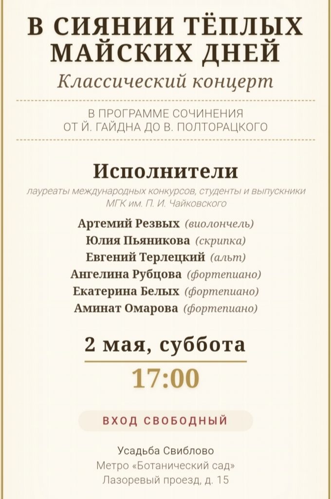 Домашняя/"Классика рядом с домом"/Расписание концертов на май 2026 г. "Классика рядом с домом""Московское долголетие"АнонсИнформационныеКонцерты проекта "Воскресный вечер в Усадьбе"Мероприятия в УсадьбеМосковское долголетиеПриходские новости Расписание концертов на май 2026 г. Пресс-служба4 часа назад 8 Less than a minute Пресс-служба4 часа назад 8 Less than a minute Facebook Twitter Pinterest VKontakte Odnoklassniki Messenger Messenger WhatsApp Telegram Viber Share via Email Печать