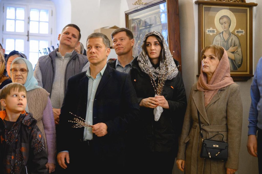 В завершении богослужения духовенство во главе с архипастырем совершили славление праздника, после чего митрополит Арсений окропил вербы святой водой.
