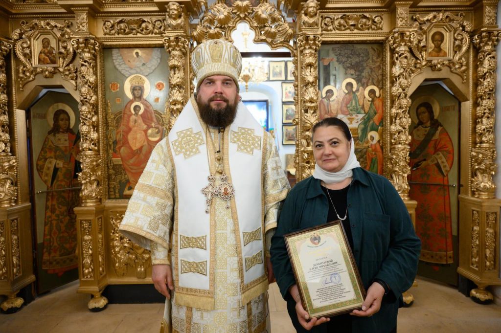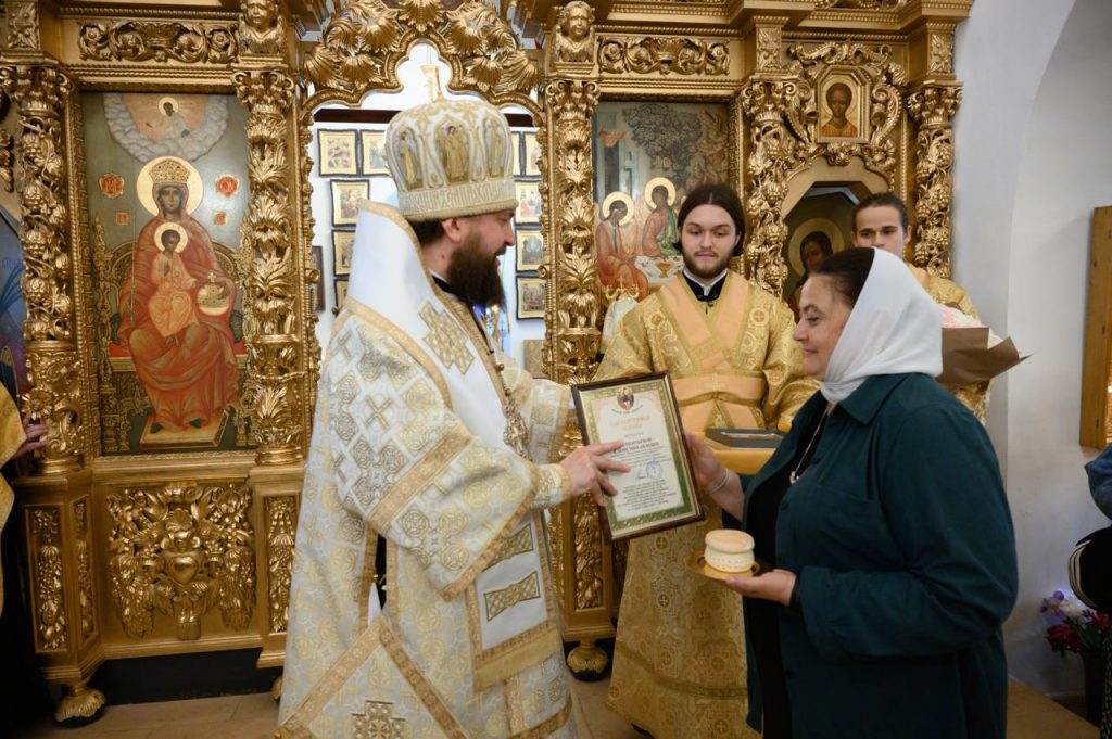 В завершение Литургии владыка Арсений поздравил директора православной школы имени преподобного Сергия Радонежского в усадьбе Свиблово Елену Михайловну Дементьеву с 55-летним юбилеем.