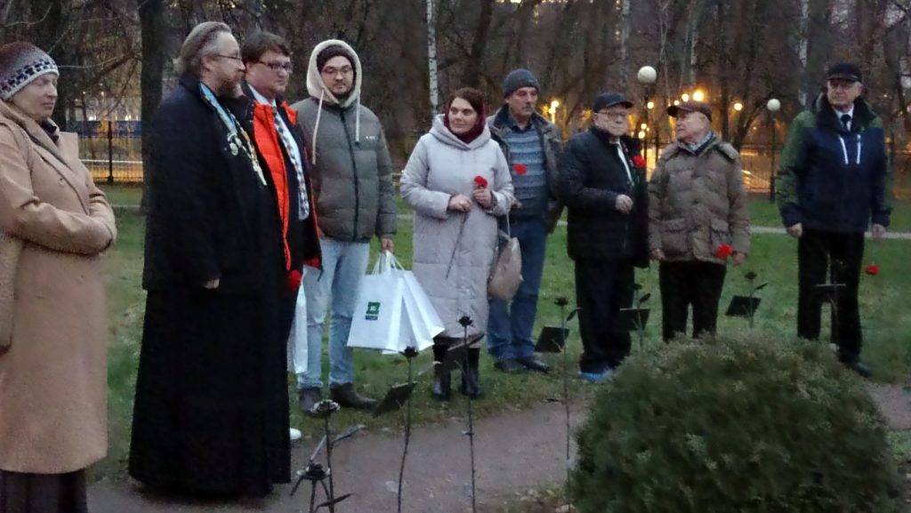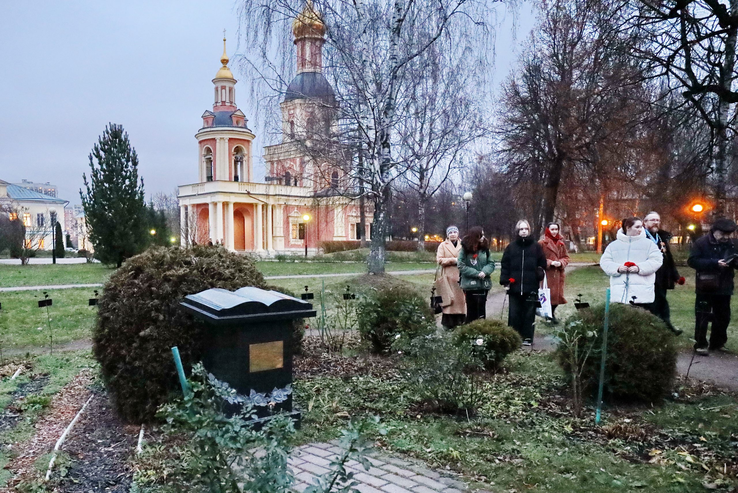 Вначале клирик храма Живоначальной Троицы в усадьбе Свиблово иерей Олег Елисеев совершил литию по погибшим воинам. На мероприятии также присутствовал клирик храма Положения Ризы Пресвятой Богородицы во Влахерне, в Леонове протоиерей Александр Тимофеев. Затем были возложены цветы к памятному знаку «Книга памяти».