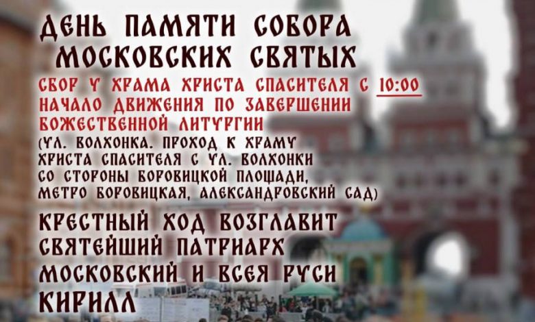 7 сентября, в день празднования Собора Московских святых, по благословению Святейшего Патриарха Московского и всея Руси Кирилла состоится общемосковский крестный ход от кафедрального соборного Храма Христа Спасителя до Новодевичьего ставропигиального женского монастыря.