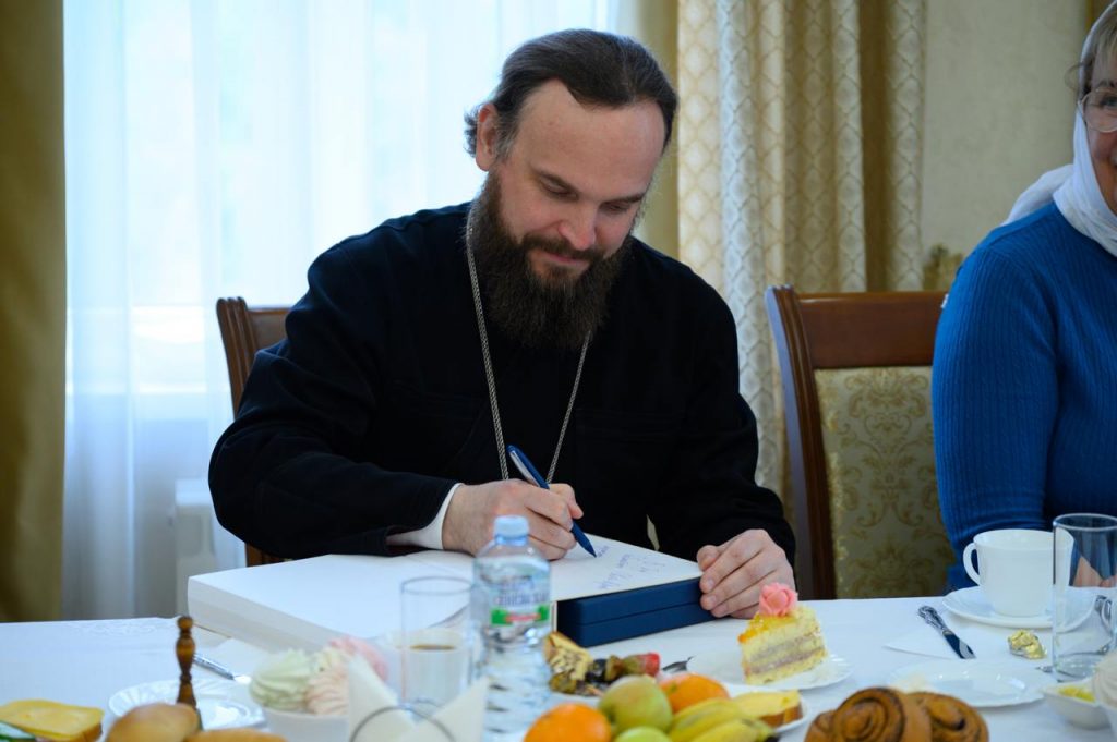 В завершение встречи владыка передал в библиотеку новгородского Свято-Юрьева монастыря книгу, изданную Институтом археологии РАН «Росписи Георгиевского собора Юрьева монастыря: археология и искусство». Как отметил архипастырь, это уникальное издание Института археологии РАН − плод многолетней кропотливой работы ученых по исследованию Георгиевского собора.