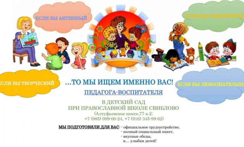 В связи с открытием дополнительной группы в дошкольном отделении «Светлячки» при НОЧУ «Православная школа Свиблово» приглашается на работу воспитатель.