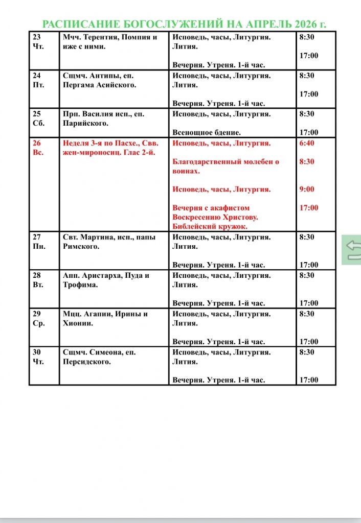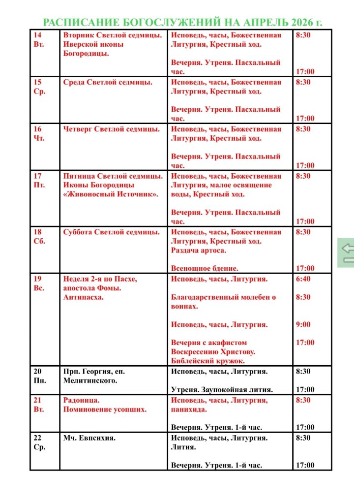Домашняя/Приходские новости/Анонс/Расписание богослужений на апрель 2026 г. АнонсБогослуженияИнформационныеПриходские новости Расписание богослужений на апрель 2026 г. Пресс-служба3 часа назад 10 Less than a minute Пресс-служба3 часа назад 10 Less than a minute Facebook Twitter Pinterest VKontakte Odnoklassniki Messenger Messenger WhatsApp Telegram Viber Share via Email Печать